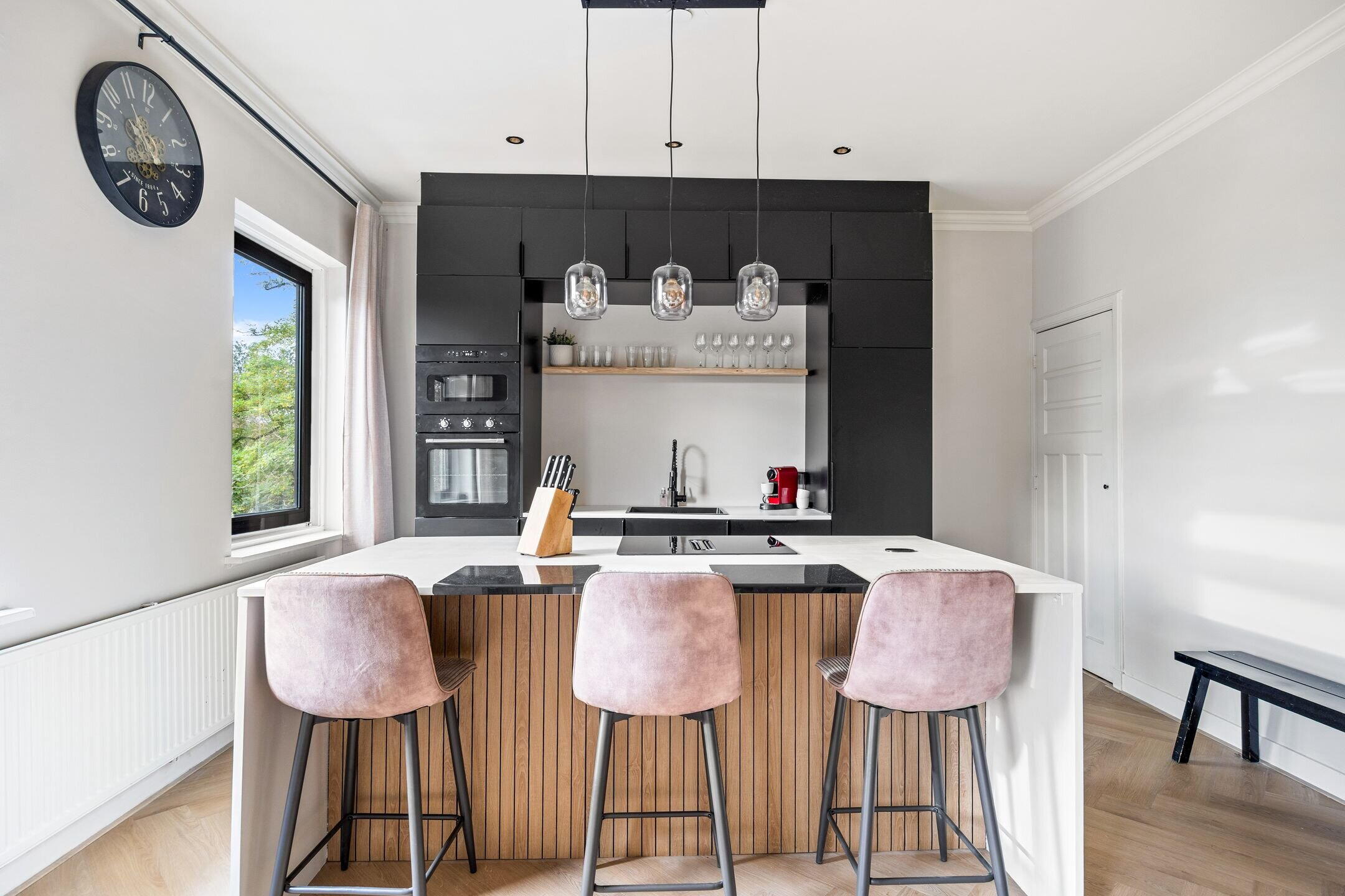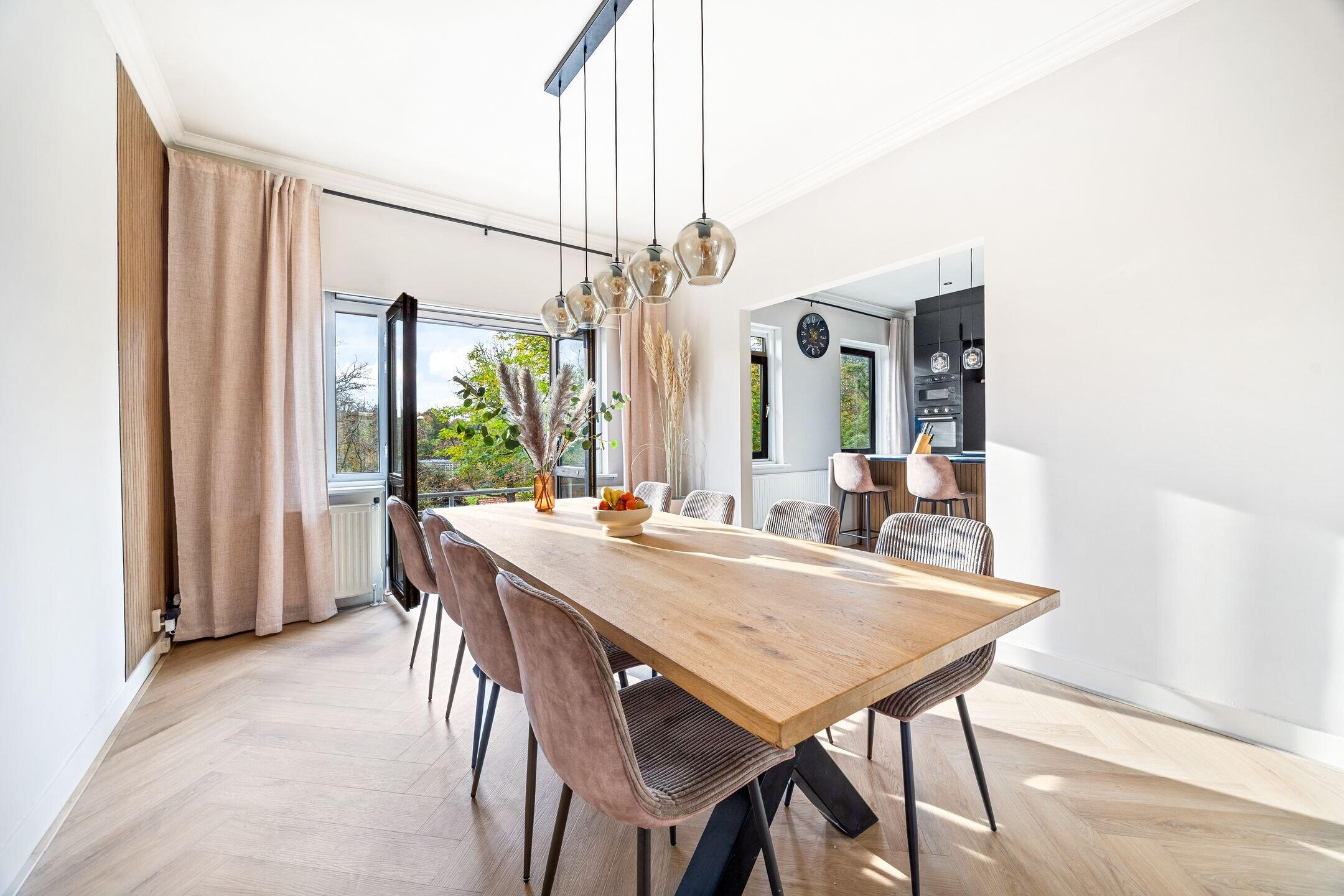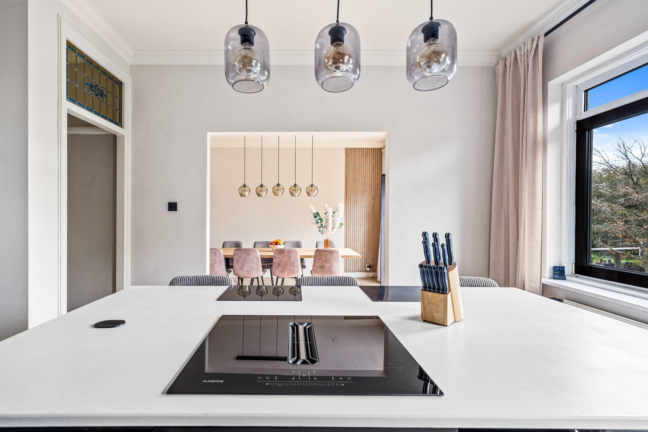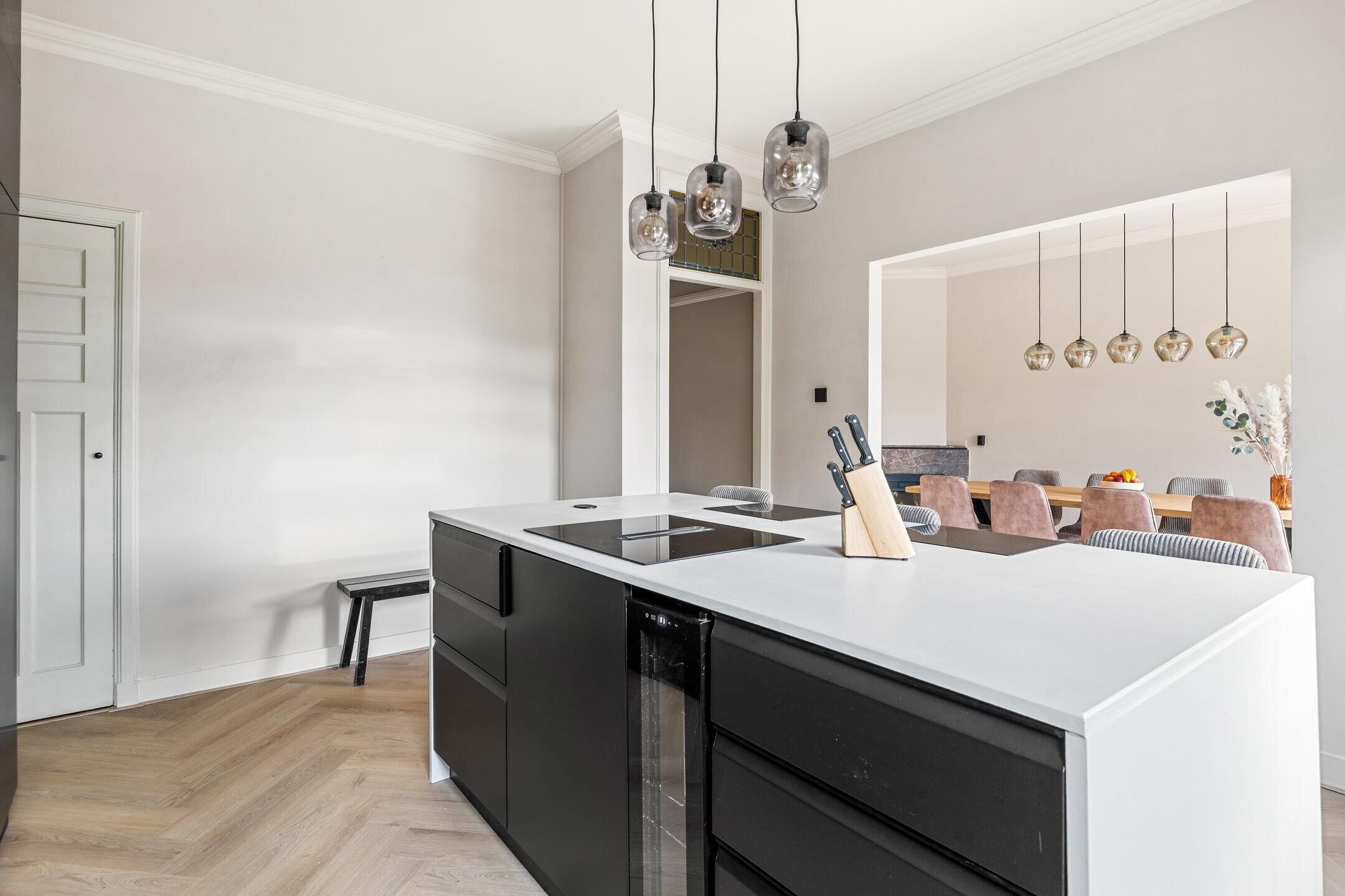 The spacious living/dining room en suite is nearly 12 metres long and features various authentic details. At the front is the dining area, directly connected to the open kitchen. The kitchen is equipped with various built-in appliances and a stylish cooking island with seating.