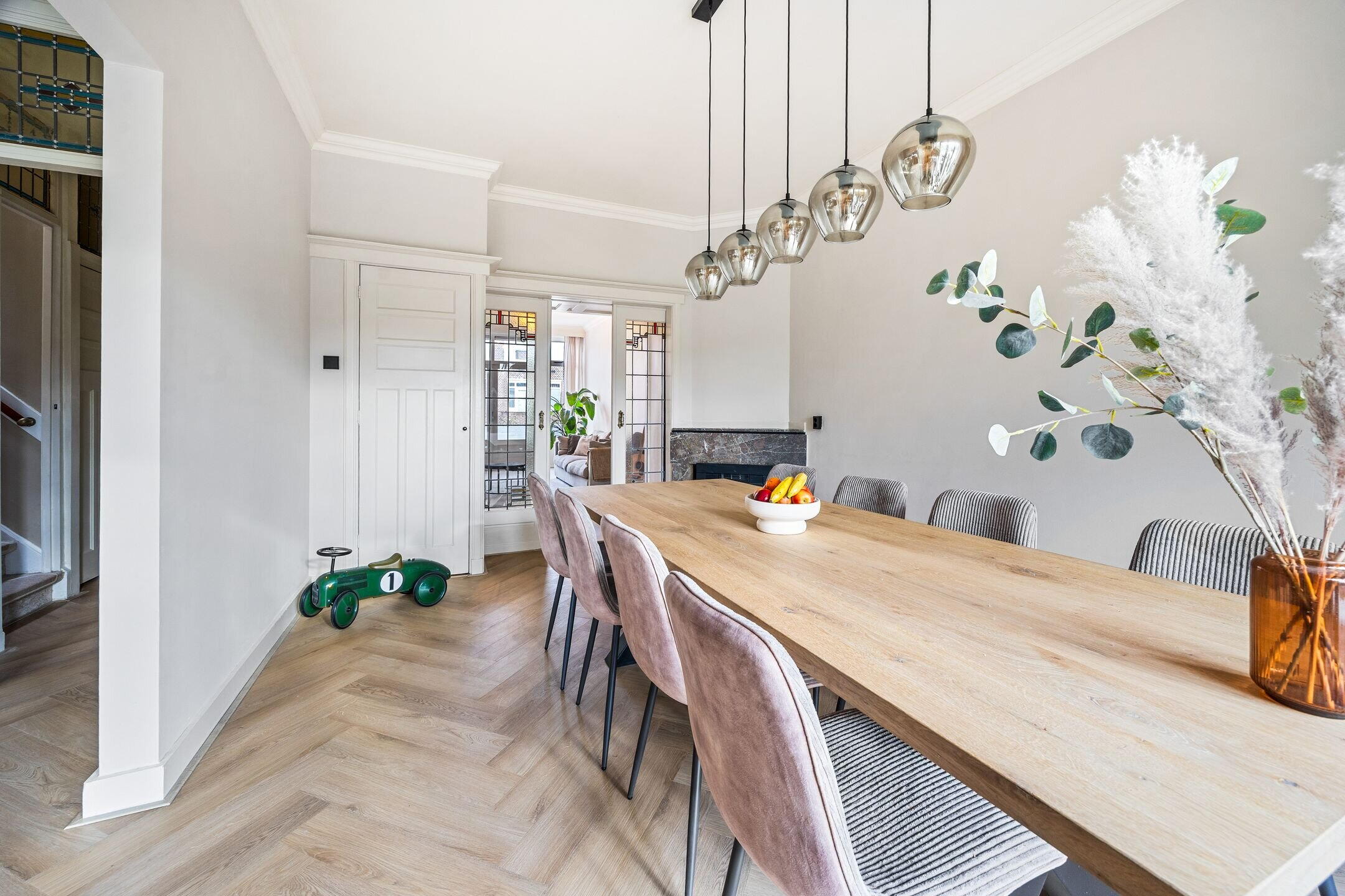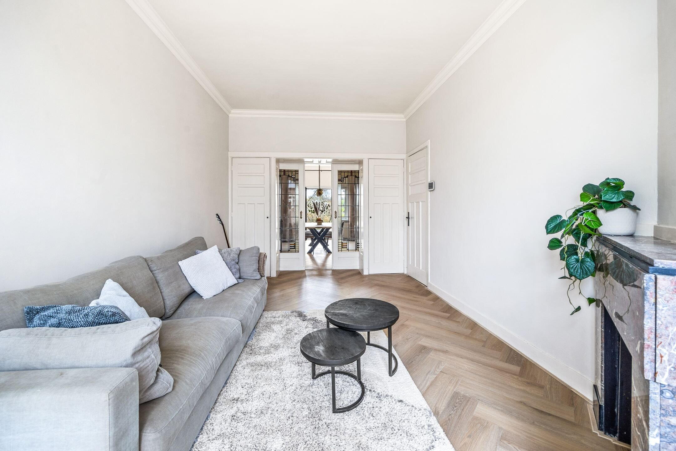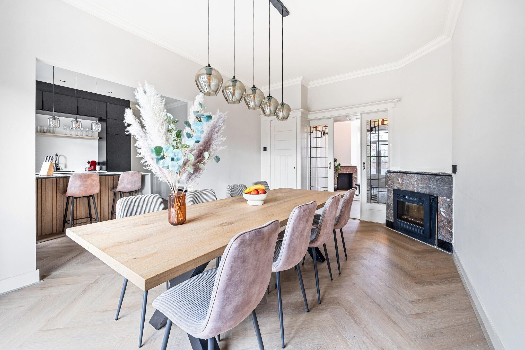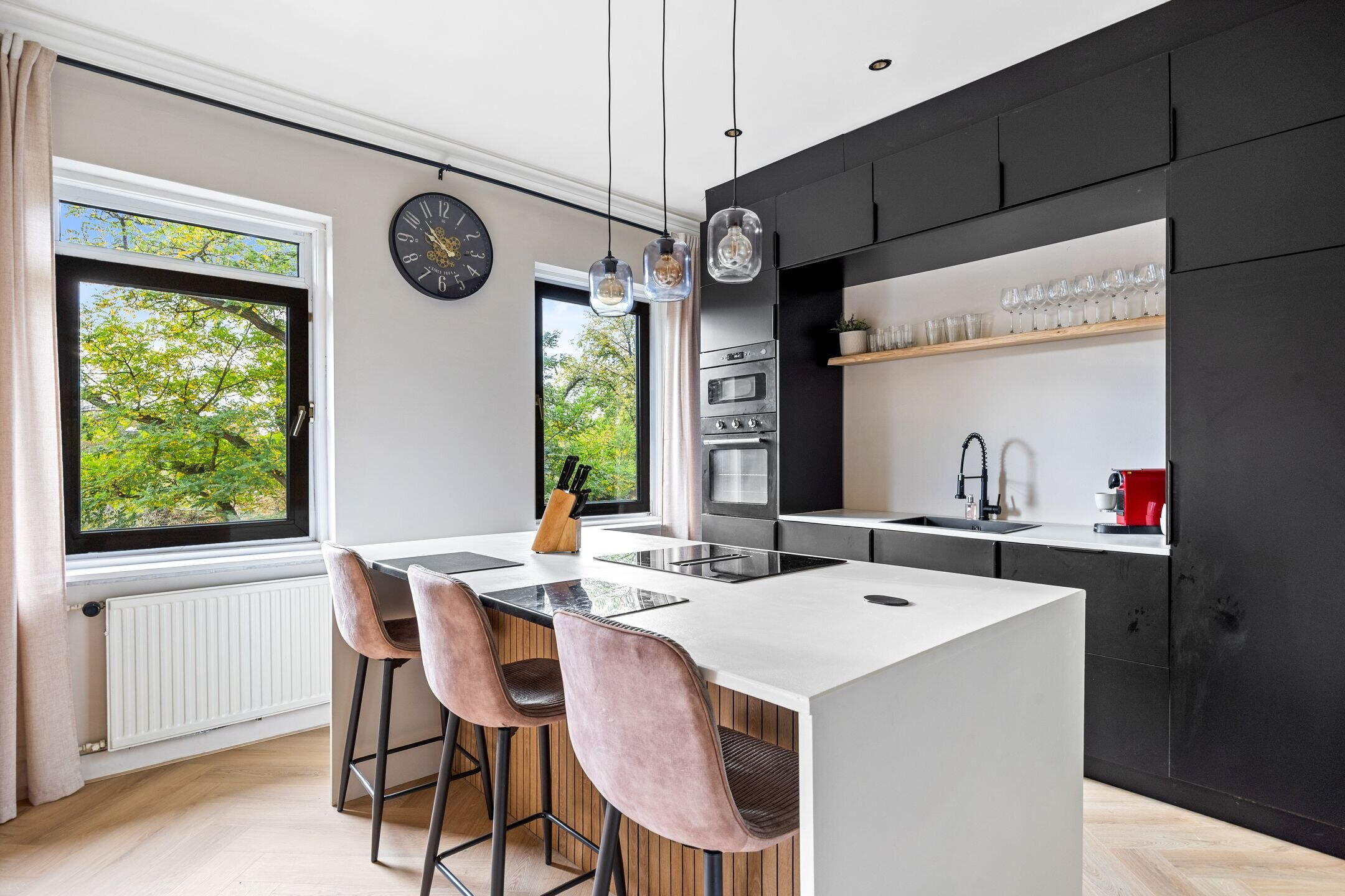 The spacious living/dining room en suite is nearly 12 metres long and features various authentic details. At the front is the dining area, directly connected to the open kitchen. The kitchen is equipped with various built-in appliances and a stylish cooking island with seating.