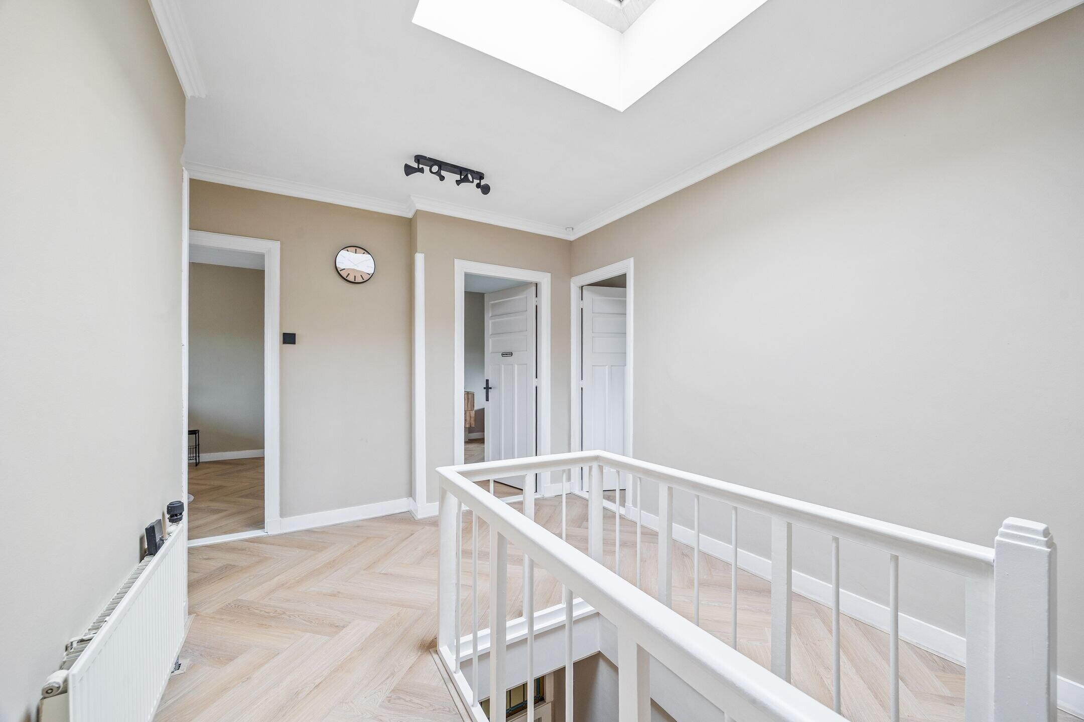Generous landing with plenty of natural light thanks to the roof dome, providing access to all rooms. At the front is a spacious bedroom and the second bathroom, equipped with a shower, washbasin cabinet and freestanding bathtub. At the rear are the remaining two bedrooms, both of ample size.
